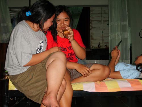 2 สาว กะมุมคุยโทรศัพท์ส่วนตั๊ว ส่วนตัว นอนคุยกันบนเตียง คุยโทรศัพท์เครื่องใครเครื่องมัน เห็นกล้องแล้วยังไม่ลืม โพสท่าซะอีก